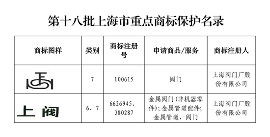 上海阀门厂股份有限公司入选 第十八批上海市重点商标保护名录